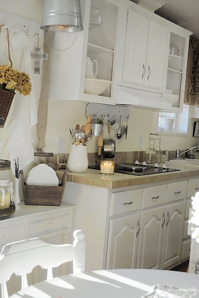 Louças, canecas,potes com utensílios, tábuas de corte, flores , um jarro antigo.Nesse espaço nada é clean.